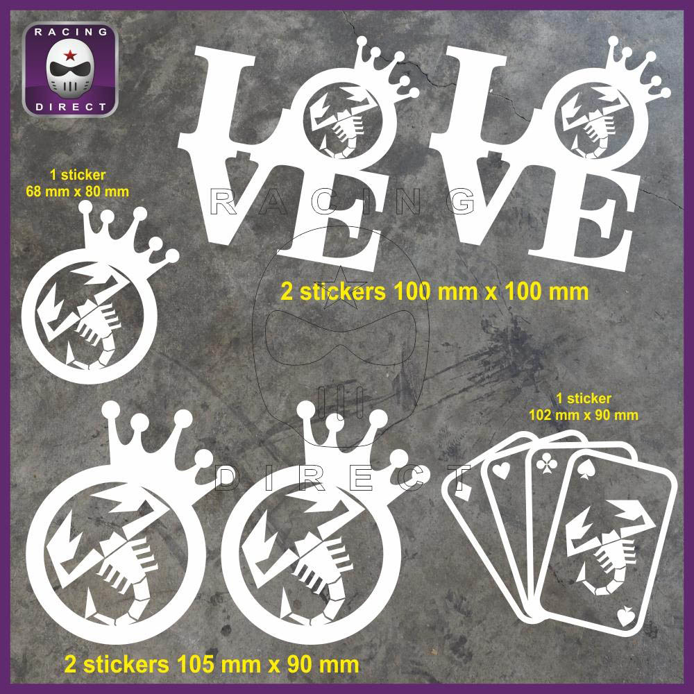 Ref. : 2834 Dimension : 2 sticker 105 mm + 2 sticker 100 mm + 1 sticker 100 mm + 1 sticker 80 mm Compatible : FIAT ABARTH Compatible Models : 500 500L 500X Panda Tipo Spider 124 Punto Qubo Doblo Talento